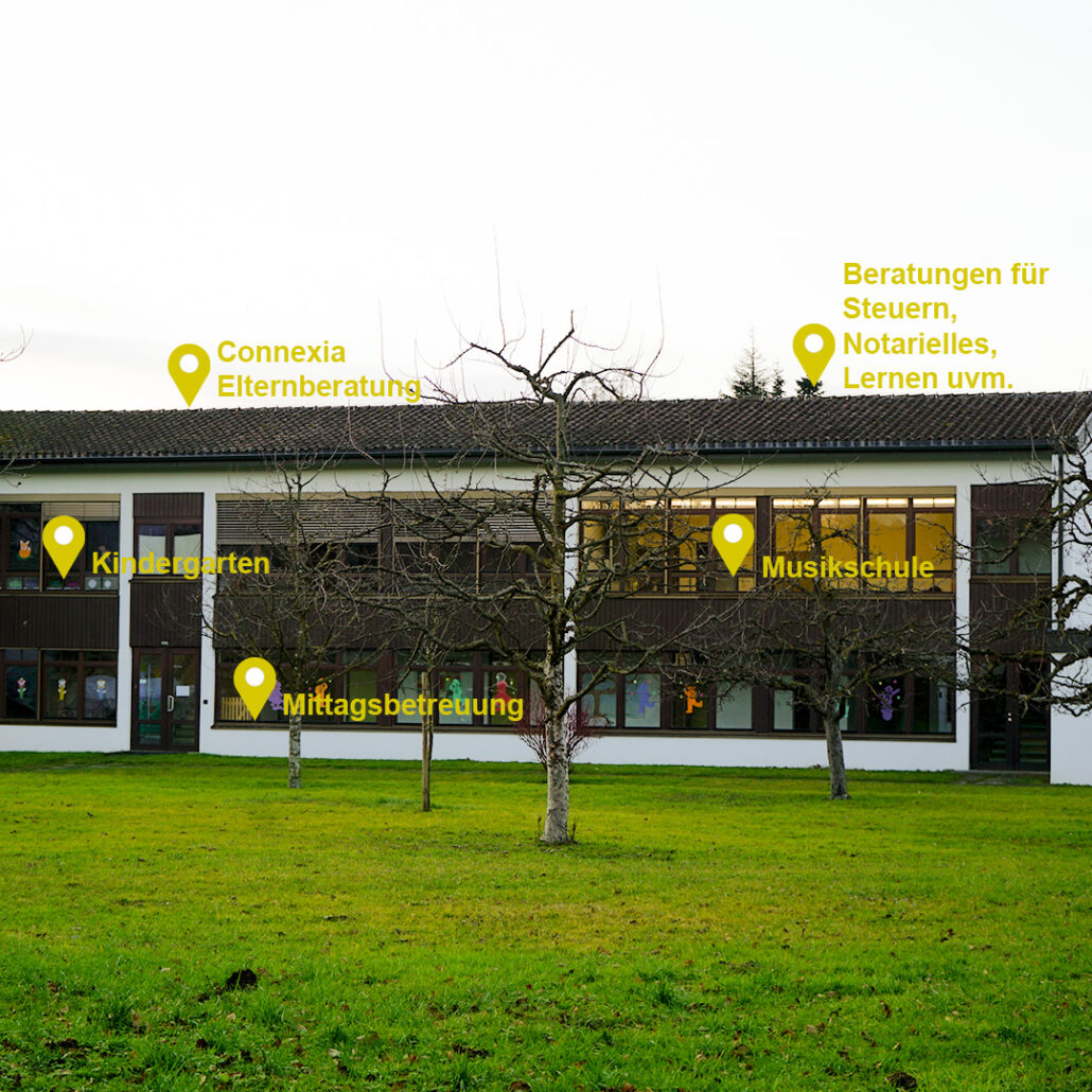 Die frühere Sonderschule wurde erhalten und als Dienstleistungszentrum renoviert. Sie bietet nun in einem attraktiven Umfeld eine Vielzahl von wichtigen Leistungen für unsere Bürger:innen: Connexia Elternberatung, Lernberatung, Kindergarten und Mittagsbetreuung, Musikschule, Amtstage Notare und Steuerberater.
